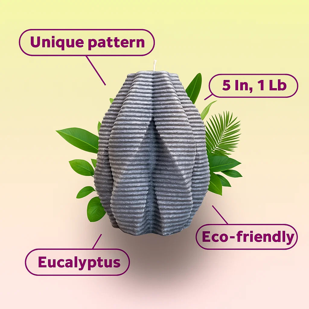 Indulge in the perfect combination of real handmade candle and a pleasant scent with Blossom, Wet Stone, Eucalyptus. Made of eco-friendly palm fruit wax, each candle boasts a unique pattern and a vegan blend of musk, oak, and the main scent - eucalyptus. Hand-poured with love, these candles are sure to brighten up any room!