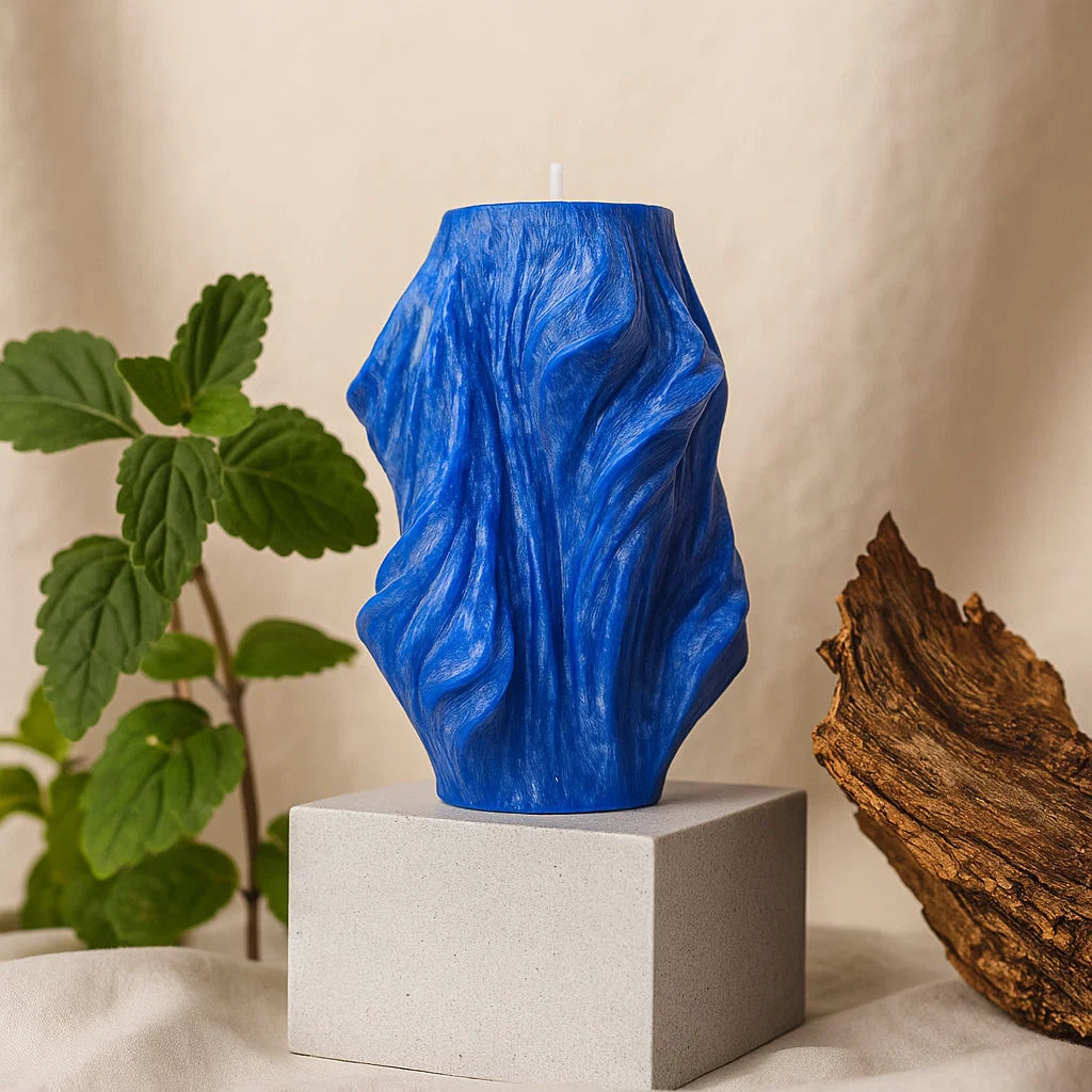 Illuminate your life with our handmade "Deep Ocean" Veil candle. Enjoy the pleasant blend of earthy and woody scents, highlighting the main scent of patchouli. Each candle is one of a kind, made with vegan, eco-friendly palm fruit wax. Elevate your space with a touch of quirkiness.
