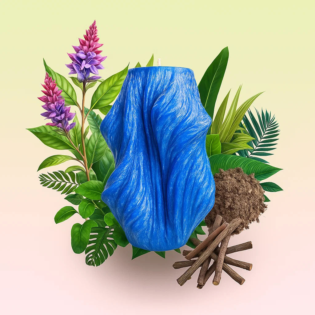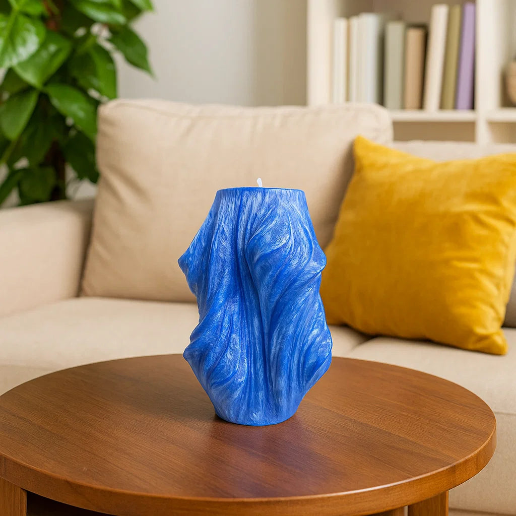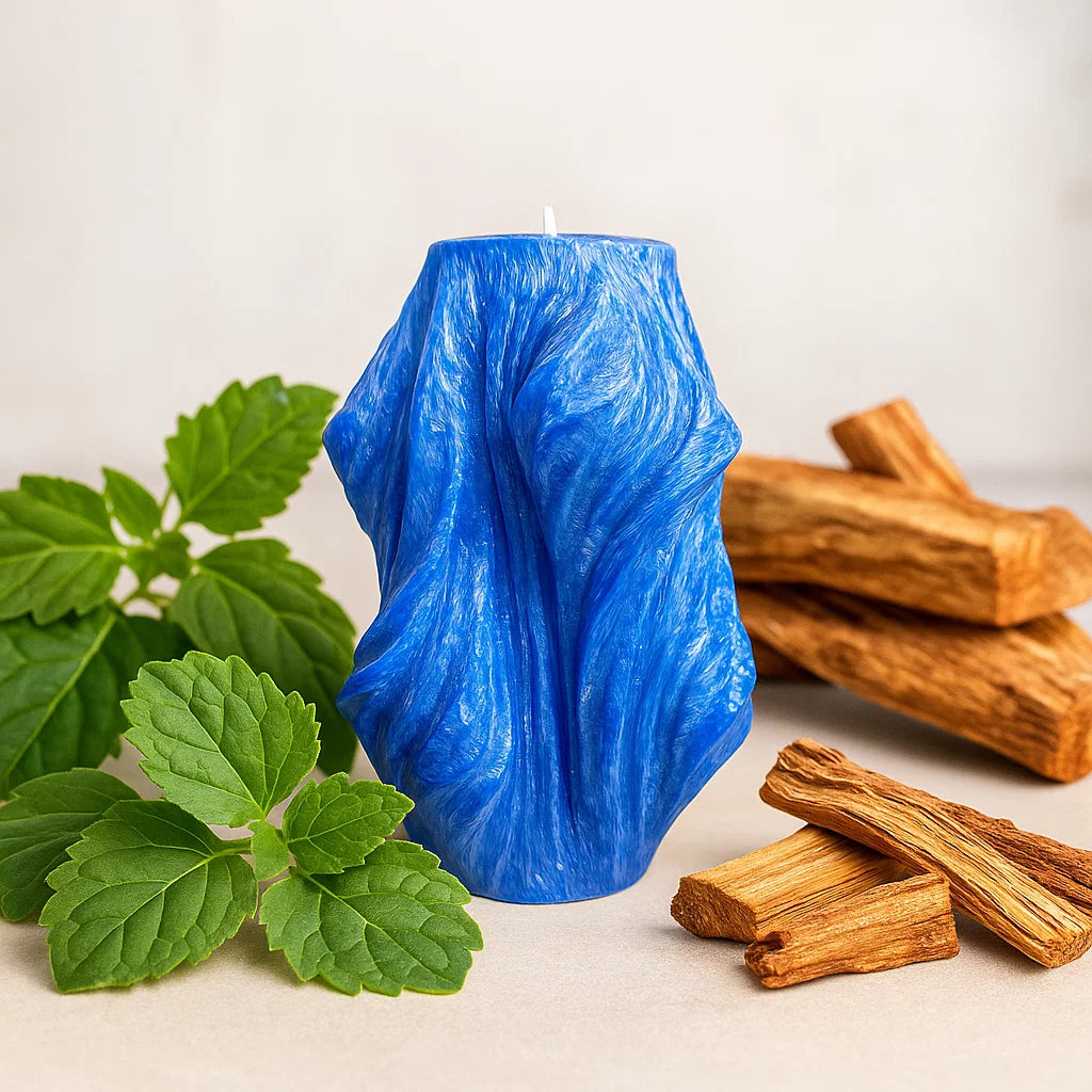 Illuminate your life with our handmade "Deep Ocean" Veil candle. Enjoy the pleasant blend of earthy and woody scents, highlighting the main scent of patchouli. Each candle is one of a kind, made with vegan, eco-friendly palm fruit wax. Elevate your space with a touch of quirkiness.